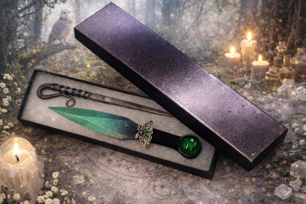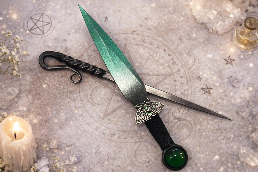 Lunar Moth Athame: Green Ombre Altar Dagger, Glass Stone (6.5 Inch) Scribe Optional